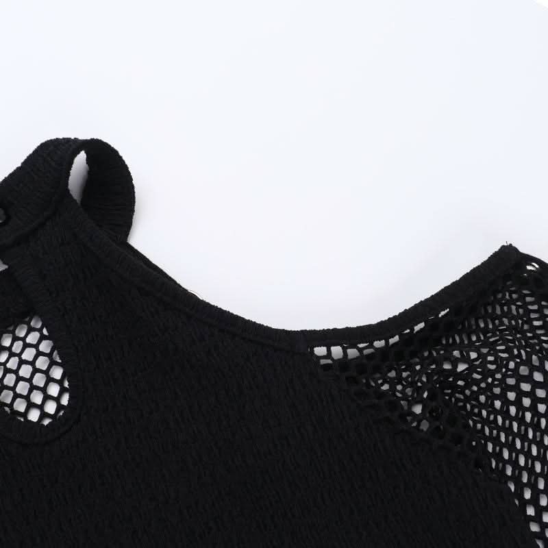 Off shoulder long sleeve fishnet patchwork buckle top