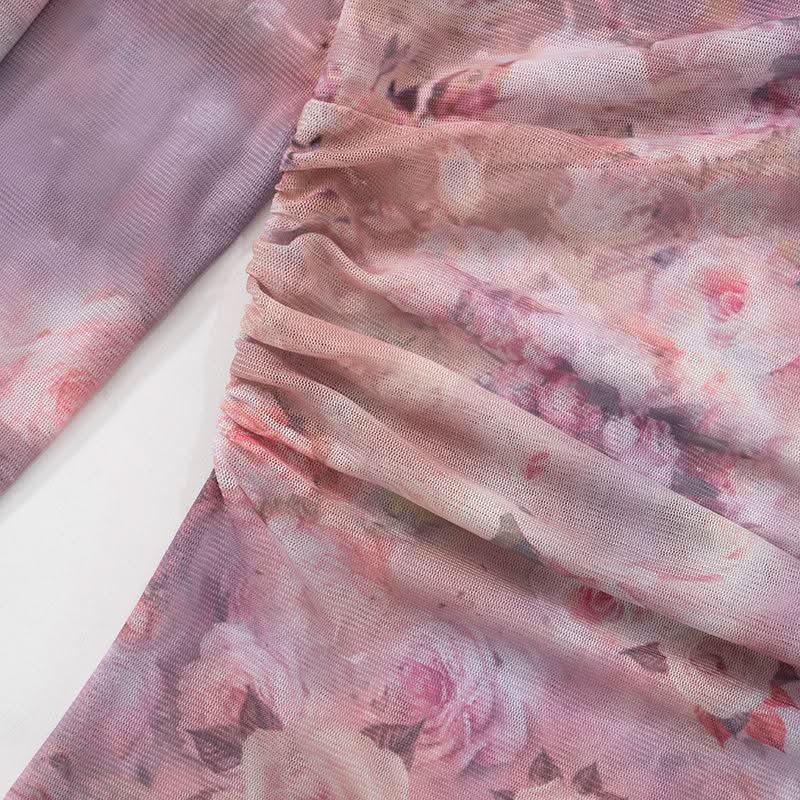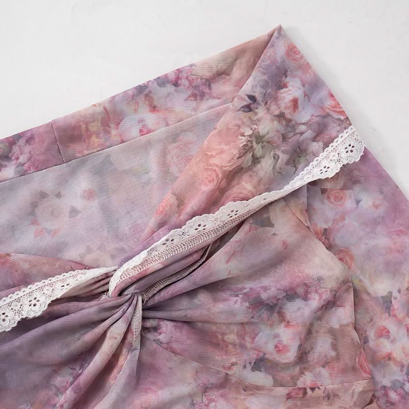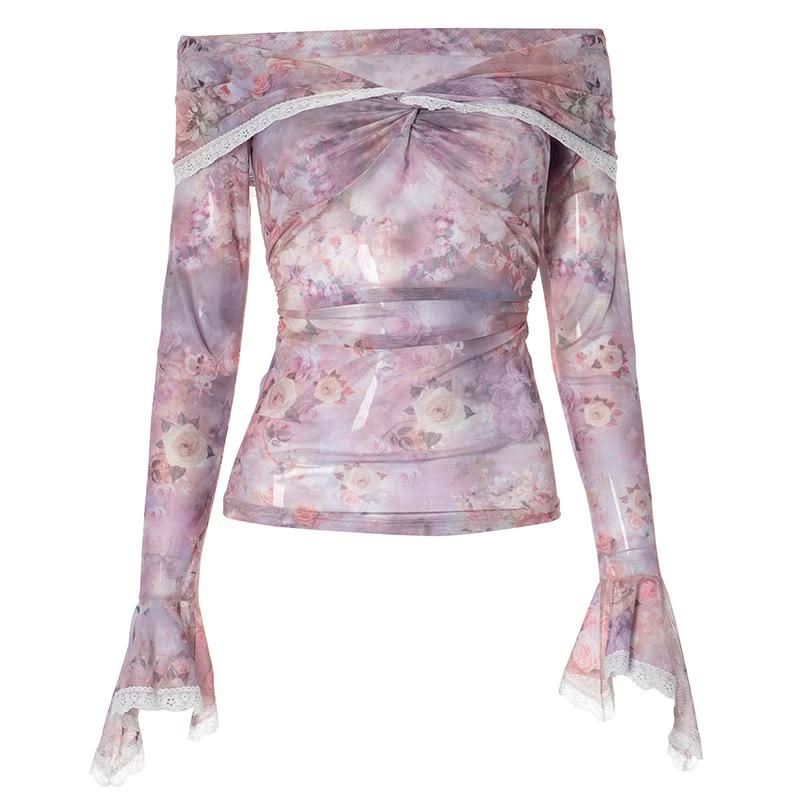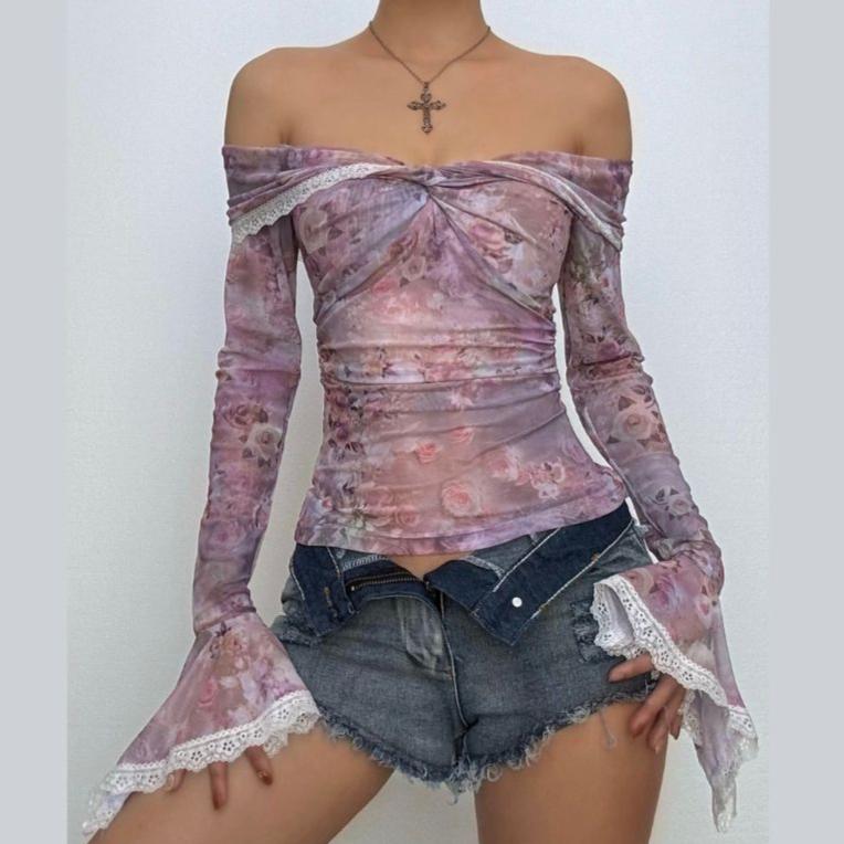 Off shoulder long sleeve flower print lace hem mesh top
