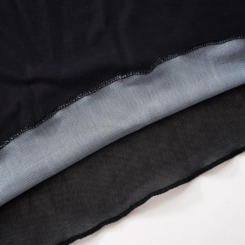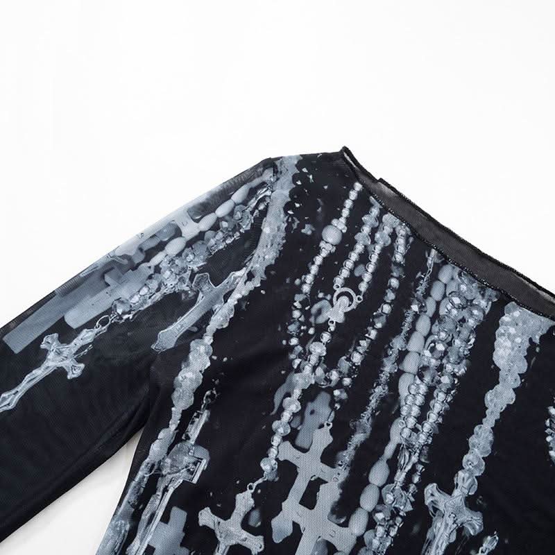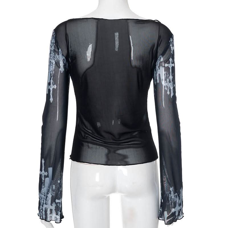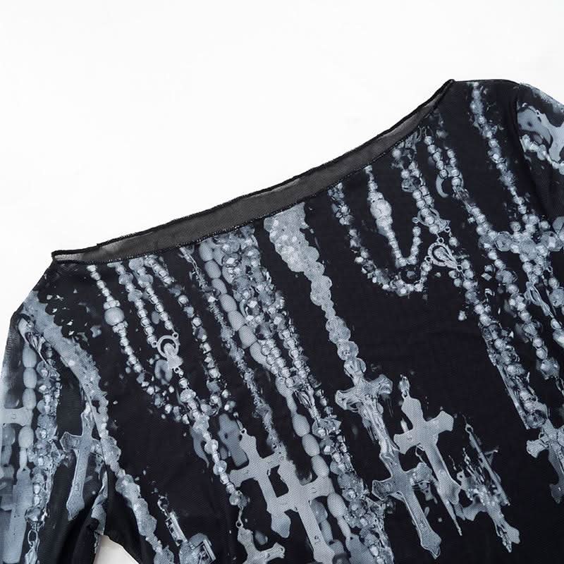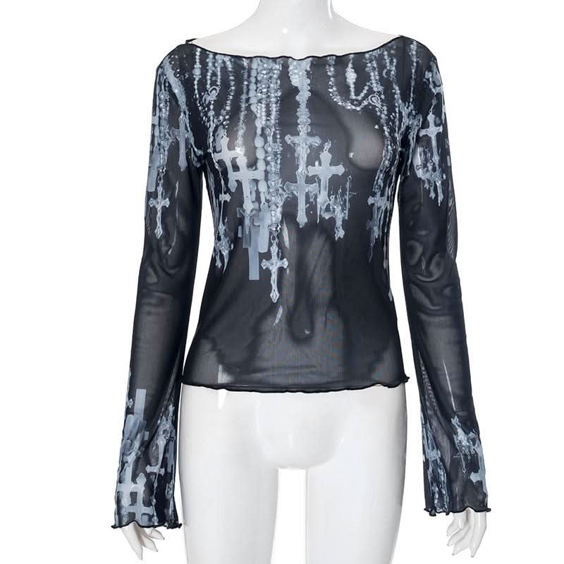 Off shoulder long sleeve mesh cross print top