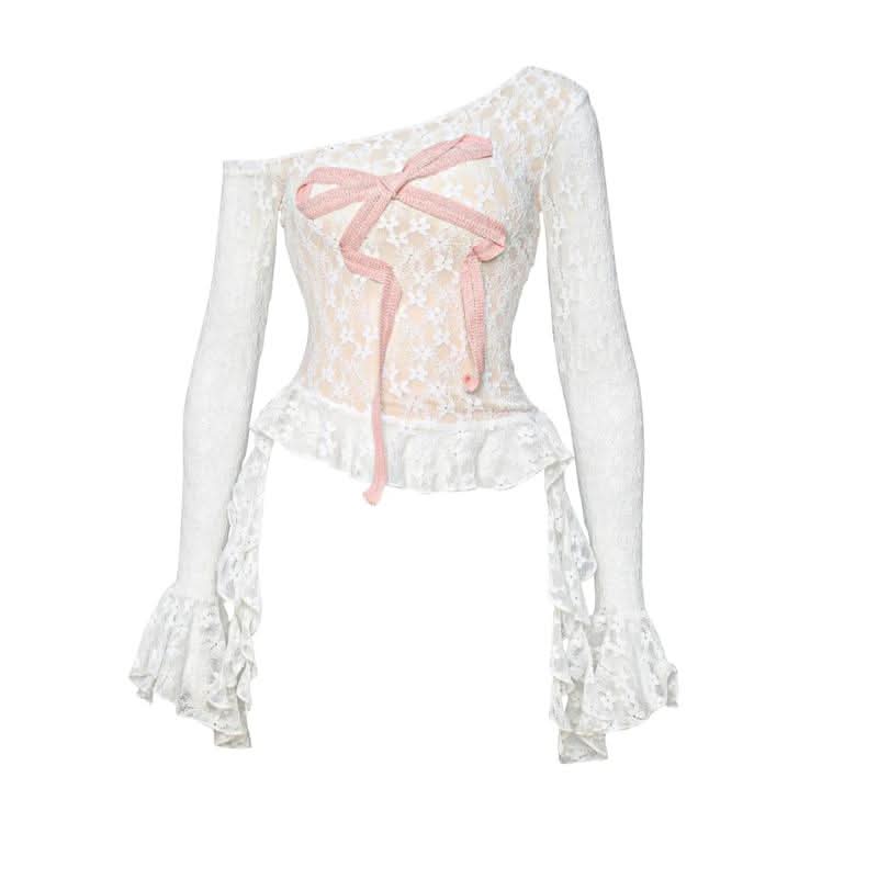 One shoulder long flared sleeve lace hem bowknot top