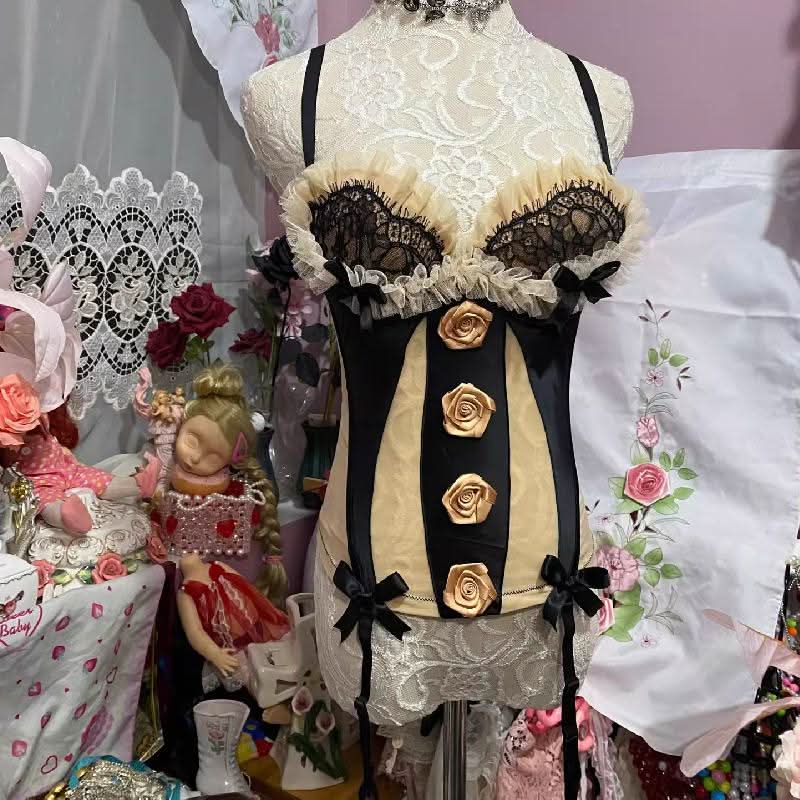 Ruffle v neck flower applique bowknot lace up top