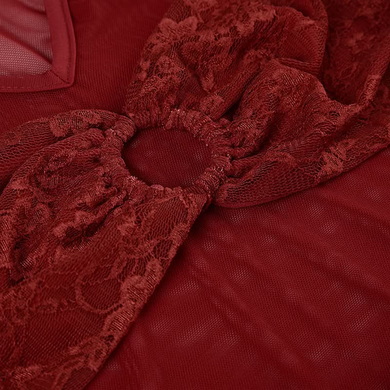 V neck long sleeve o ring lace mesh top