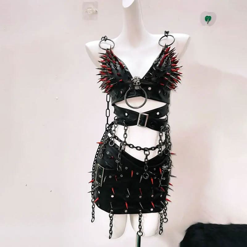V neck o ring rivet PU leather buckle cami mini skirt set