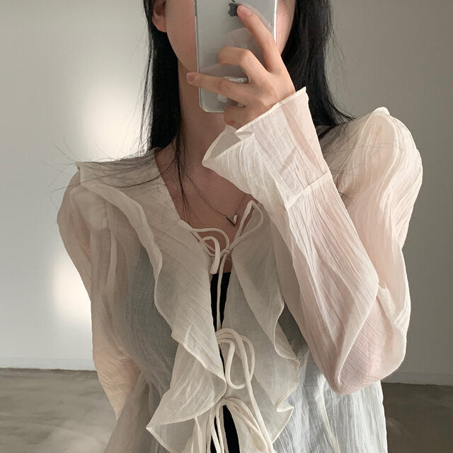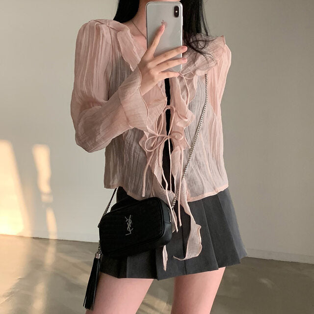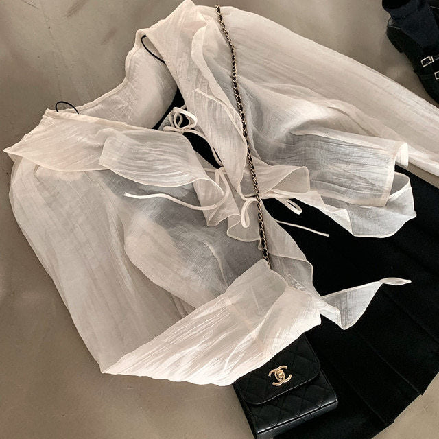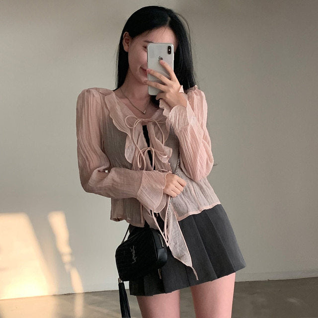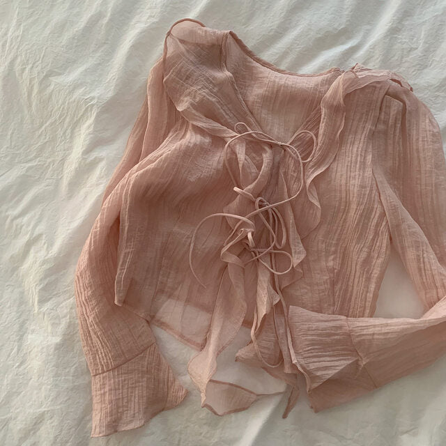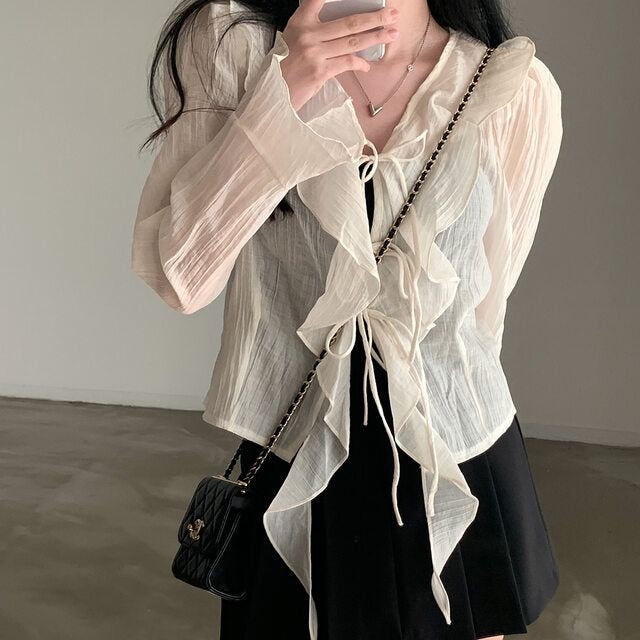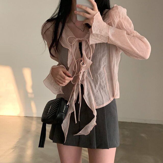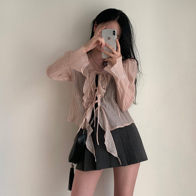 V-neck ruffled lace-up long sleeve top