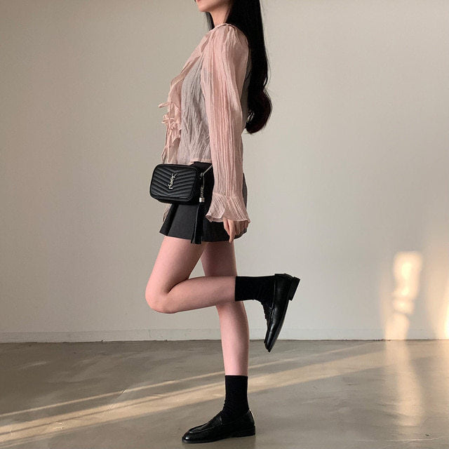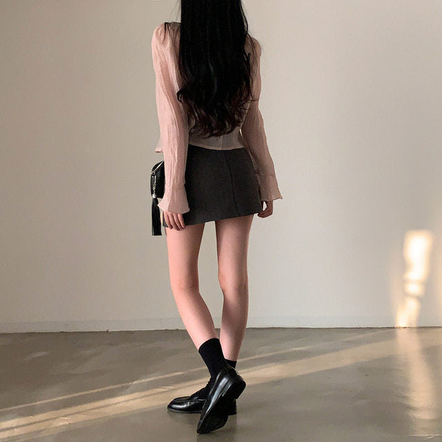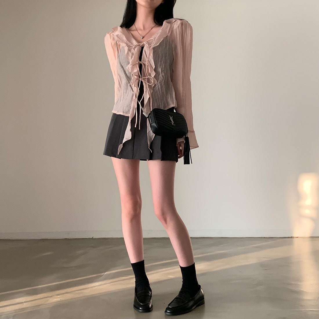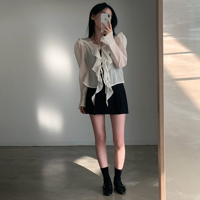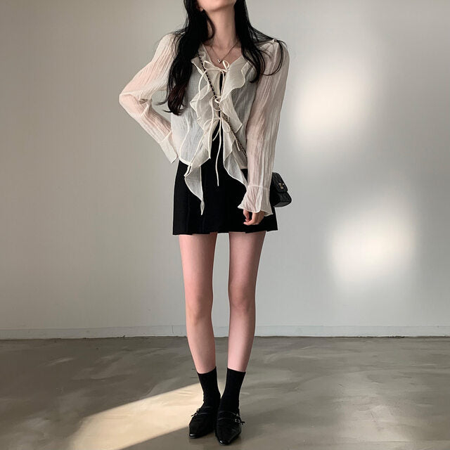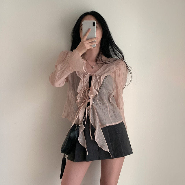 V-neck ruffled lace-up long sleeve top