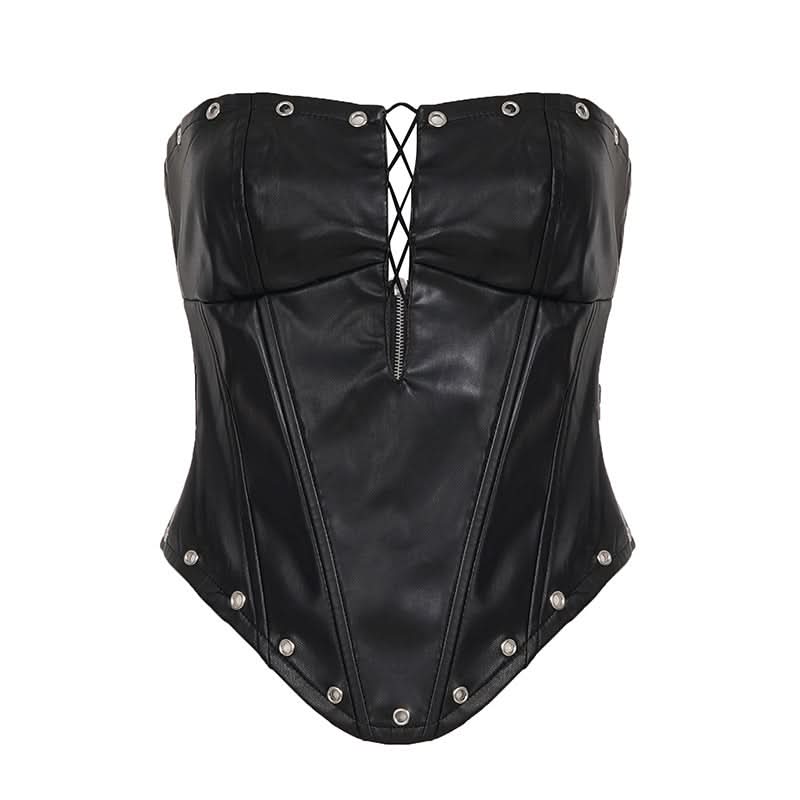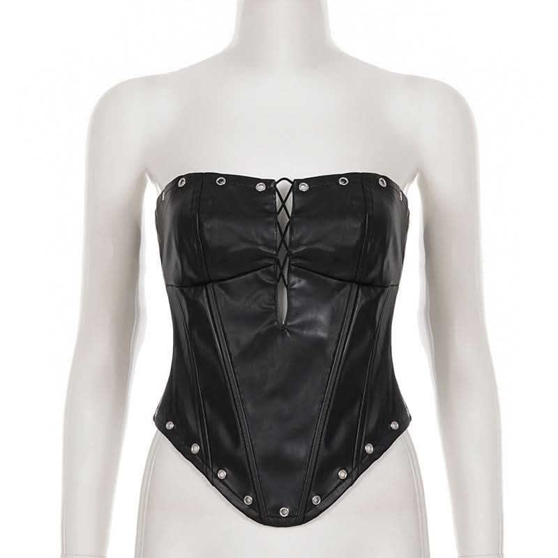 Zip-up hollow out PU leather corset tube cut out top